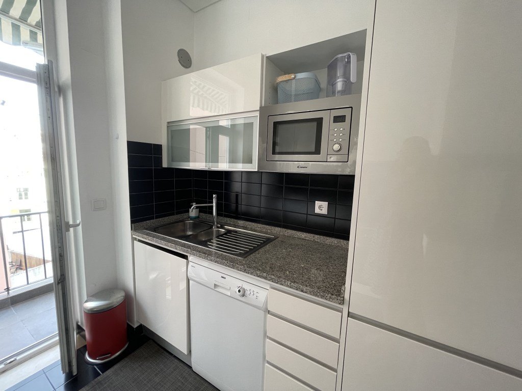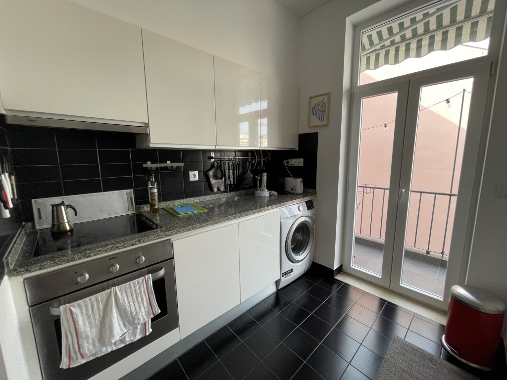 A cozinha é muito prática, equipada com forno, placa, microondas, frigorífico combinado, máquina de lavar louça e máquina de lavar roupa. Também dá acesso à varanda dos fundos, onde ficam uma mesa e um estendal de teto.