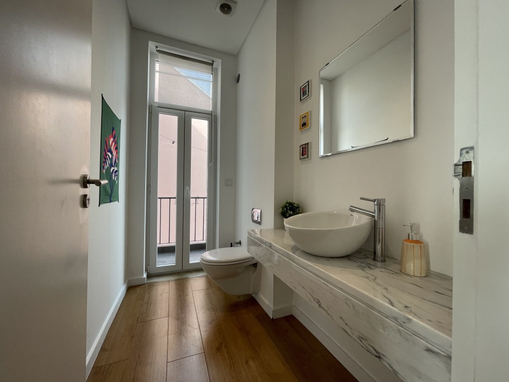 A sala tem um pequeno hall de entrada junto a uma charmoso lavabo e é bem dividida entre zona de jantar e zona de estar. Da varanda da sala vê-se o casario da Graça e um pedaço do Rio Tejo.